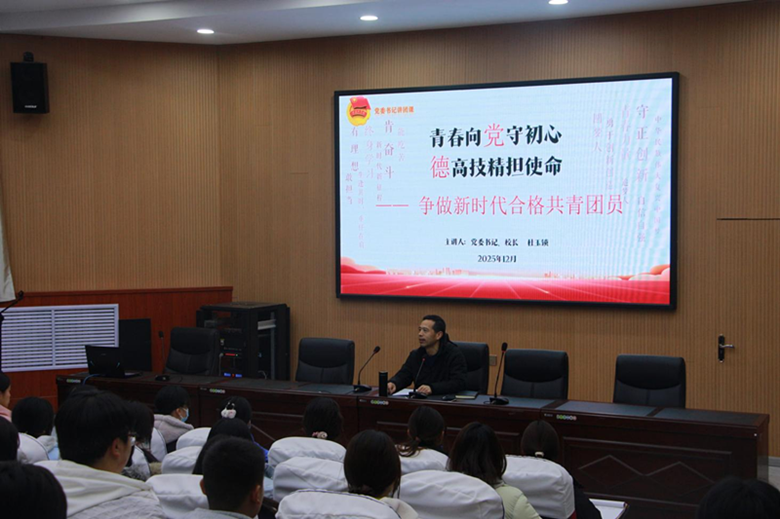 党委书记、校长杜玉锁以 “青春向党守初心 德高技精担使命” 为主题,围绕中国共产主义青年团的性质宗旨、百年奋斗历程展开讲解,清晰梳理了共青团在革命、建设、改革不同历史时期发挥的重要作用,帮助学生理解“党有号召,团有行动”的优良传统。