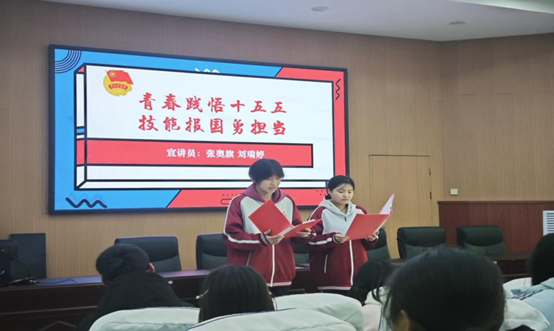 校宣讲队张奥旗、刘瑞婷两名同学,从思想、技能、实践三方面进行了“青春践悟‘十五五’,技能报国勇担当”的主题宣讲。在互动交流环节,团员围绕“个人学习如何融入国家规划”等问题踊跃发言、积极提问,现场氛围热烈。