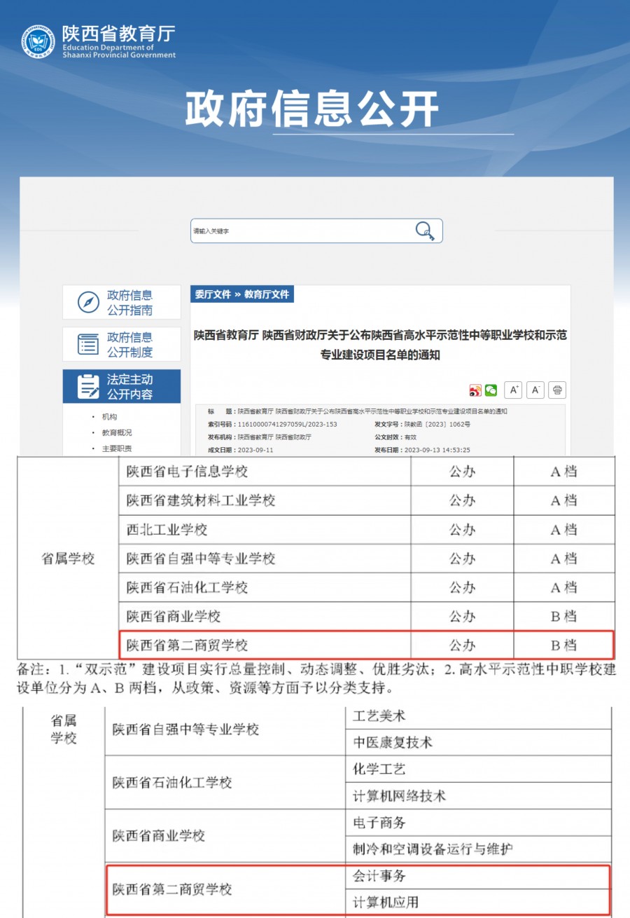 近日,省教育厅、省财政厅公布了陕西省高水平示范性中等职业学校和示范专业(简称“双示范”)建设项目名单,陕西省第二商贸学校榜上有名:学校被确定为陕西省高水平示范性中等职业学校建设单位;会计事务、计算机应用两个专业被确定为陕西省高水平示范专业建设项目,这是学校高质量发展的又一重要成果。