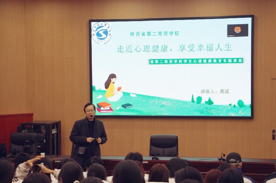 12月3日下午,陕西省第二商贸学校邀请宝鸡市中小学心理健康指导中心专家周诚老师,为全校师生开展“走近心理健康 享受幸福人生”为主题的心理健康知识讲座。讲座由校保健室老师雪杰主持。
