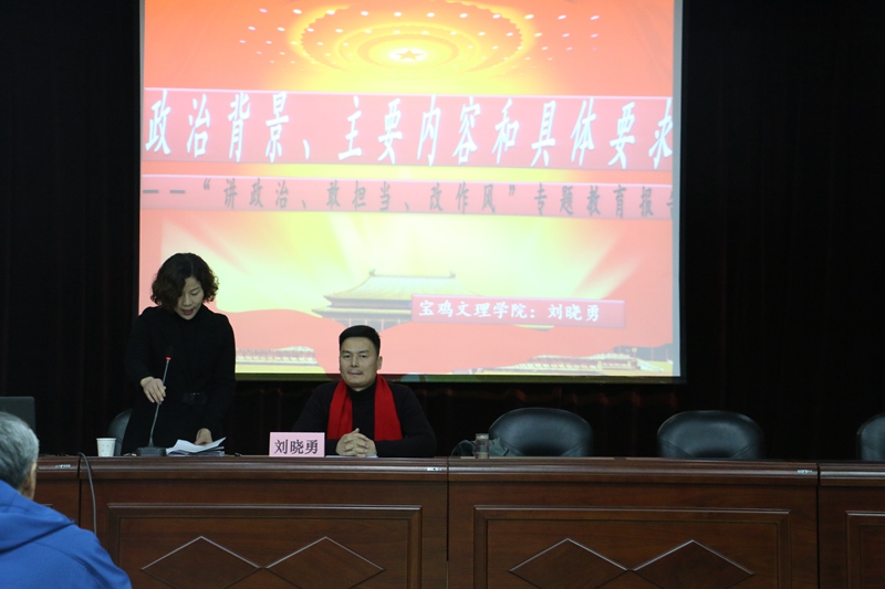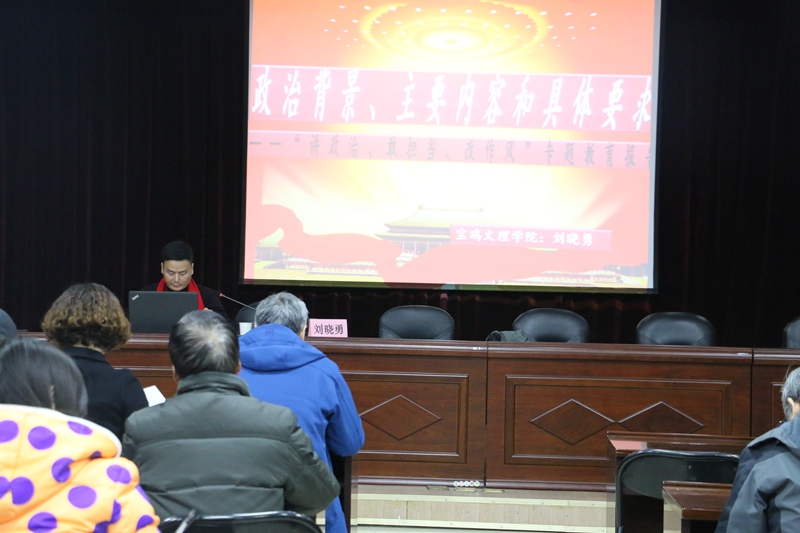 为扎实推进学校“讲政治、敢担当、改作风”专题教育,1月8日,我校邀请宝鸡市委理论讲师团成员、宝鸡文理学院马克思主义学院副院长、副教授刘晓勇博士为学校全体党员作了“讲政治、敢担当、改作风”专题教育报告。非党员中层干部也参加了报告会。学校副校长闫小艳主持报告会。